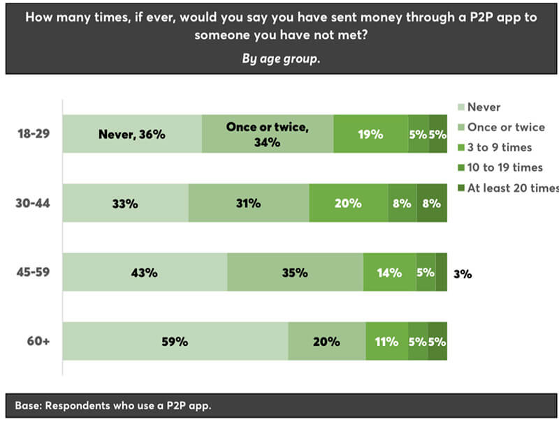 - 18-29 yaş: %34'ü 1-2 kez, %19'u 3-9 kez, %5'i 10-19 kez P2P işlemi yapmıştır. %34'ü hiç böyle bir işlem yapmamış;