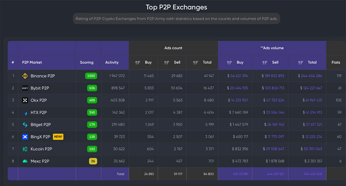 Tanınmış kripto borsalarının P2P platformları (aynı adı taşıyan CEX'lerle birlikte, aynı ekosistemin bir parçasıdırlar: örneğin, Binance'deki Binance P2P) 2024'te kullanıcı sayısı ve eşler arası ticaret hacmi açısından EN İYİLERDE: