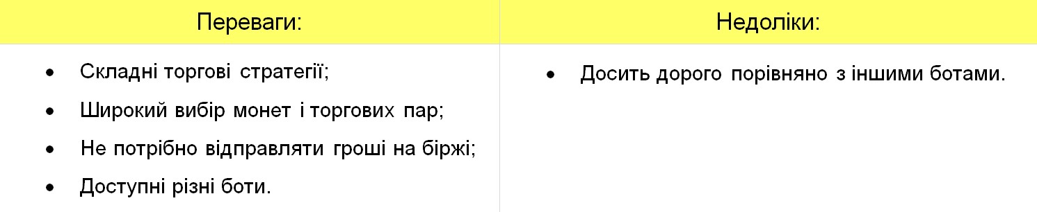 HaasBot. Бот створено HaasOnline у 2014 році і функціонує як сервіс автоматичної торгівлі, що дозволяє торгувати кількома цифровими активами. Платформа надає трейдерам набір інструментів, який включає кілька ботів, які можна налаштувати, індикатори та інші розширені функції, призначені як для новачків, так і для досвідчених трейдерів.