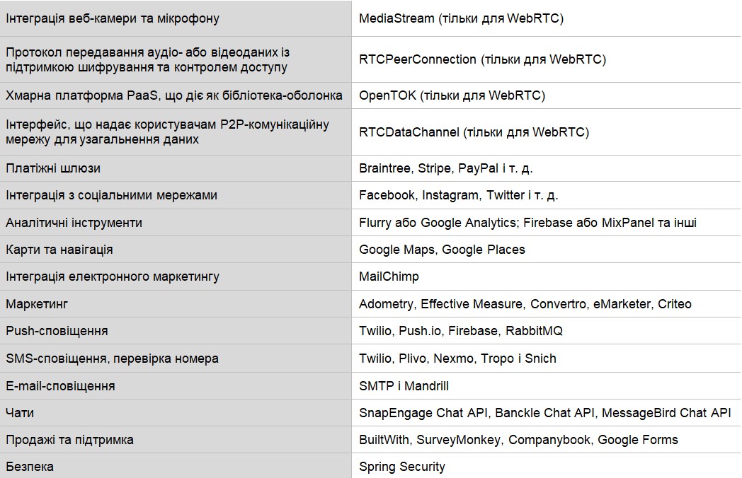 API (Application Programming Interface). Набір рішень для підключення зовнішнього і внутрішнього інтерфейсів, а також інтеграції сторонніх сервісів, що розширюють функціонал застосунку. Конкретний набір інтеграцій залежить від типу додатку, його функціоналу та додаткових можливостей. Ось які API ви можете використовувати під час створення додатку для онлайн-конференцій.