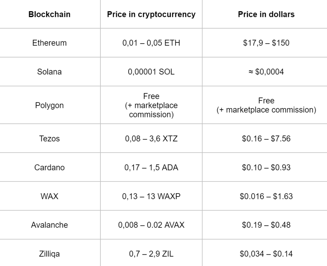 Проте, Ethereum не є єдиним рішенням, для запуску NFT можна також використовувати Solana, Polygon, Tezos, Cardano та інші криптовалюти. Нижче наведено порівняння цін на карбування NFT на різних блокчейнах.
