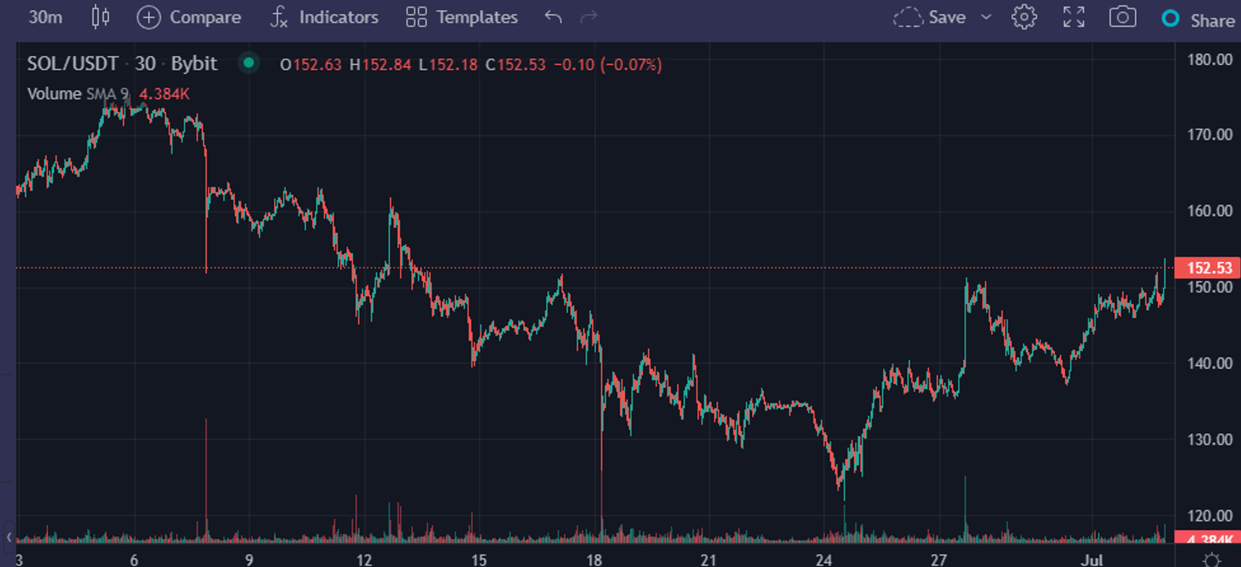 Ідеально буде, якщо торговий бот зможе видавати графік із лінією тренду за обраний період – за місяць чи квартал, рік та з дати лістингу. Порівняння кількох криптовалют, важливих для трейдера, демонструватиме динаміку. У нашому випадку бачимо, що у BTC та Ethereum зберігається однаковий тренд зростання, незважаючи на різкі курсові коливання. У Solana тренд із наростаючою тенденцією, оскільки старт відбувся на 4 роки пізніше.